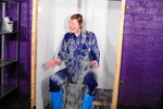 In this scene Miss Abigail gets well dripped on, and then totally drenched three times, and soaps herself up with lashings of shampoo between the first and second, and second and third, delugings. After the first few drips she gets up to put a tray on the seat, which she allows to catch the drips for a while before sitting back down again, soaking her bottom. She's wearing her boilersuit commando, no underwear, so you know she's feeling every drip and squelch. After the main drenchings she stands up and stretches to put the tank plug back in so it can start refilling again, we get nice views of the tight-fitting, soaking wet suit hugging her bottom each time she does this. As well as soaking up her suit she also gives herself a thorough hairwash, using the following deluge to rinse her hair clean again.