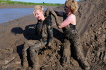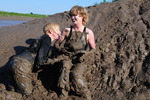 Eventually, when they've finally had enough of rolling around and over each other in the mud, they slide down the bank into the river, still fully clothed, for a rough wash-off and final wet and messy hug.