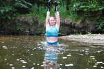 She wades into the water, exclaiming a little as the cold river floods her boots, soaks herself to the waist, turns and wades back out showing off her glistening wet leggings, then comes back in and soaks herself completely.